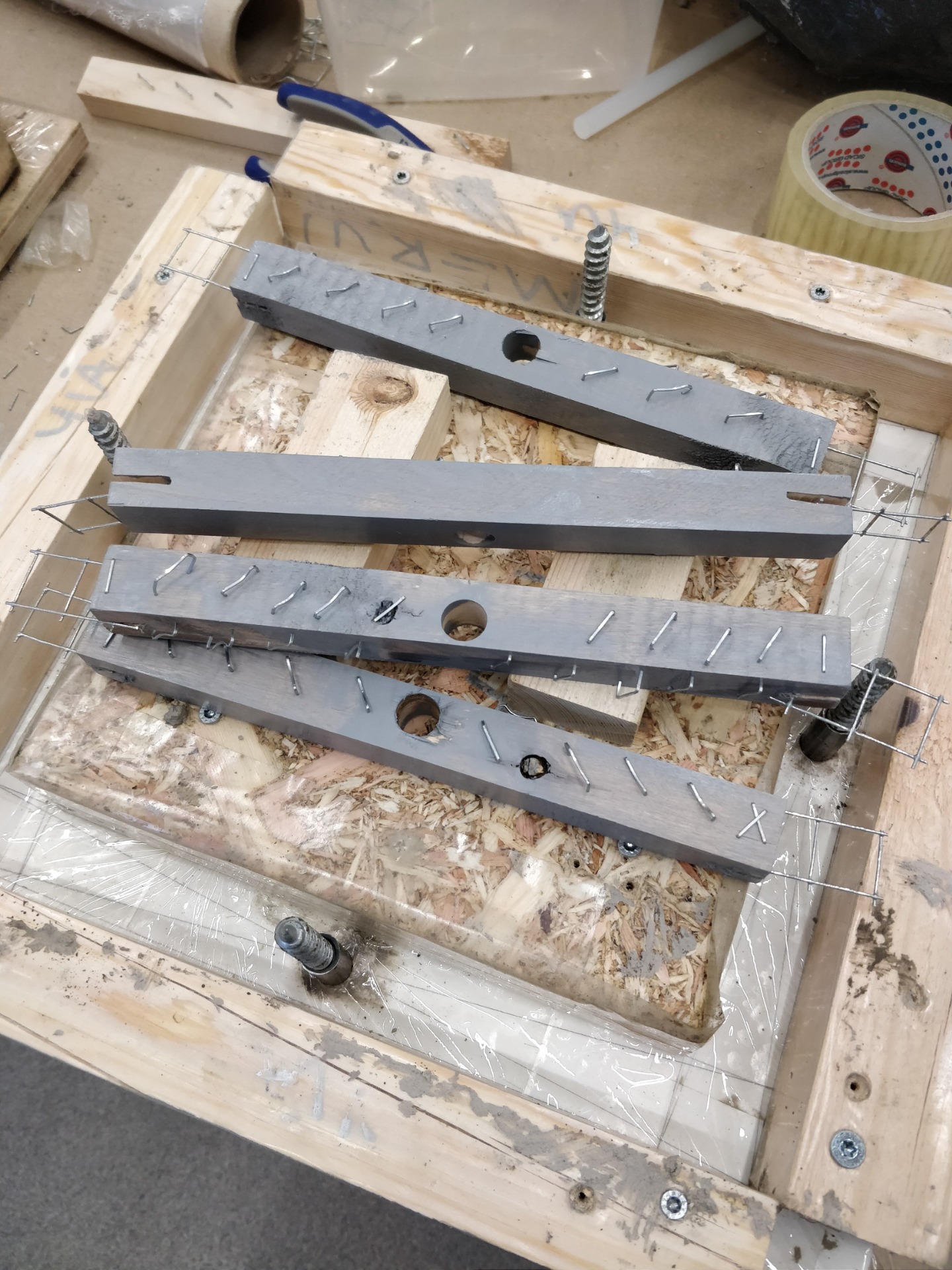 Kehitin version, millä saan kevennettyä valukerroksen painoa piilottamalla puukappaleet valuun. Vahasin puukappaleet harmaaksi. Kiinnitin puukappaleihin tarttumapinnaksi niittejä ja nurkkiin kanaverkkoa. Porasin holkkien aukot pylväsporakoneella. Valu kevennettynä painoi kuivuttuaan 1,3kg.