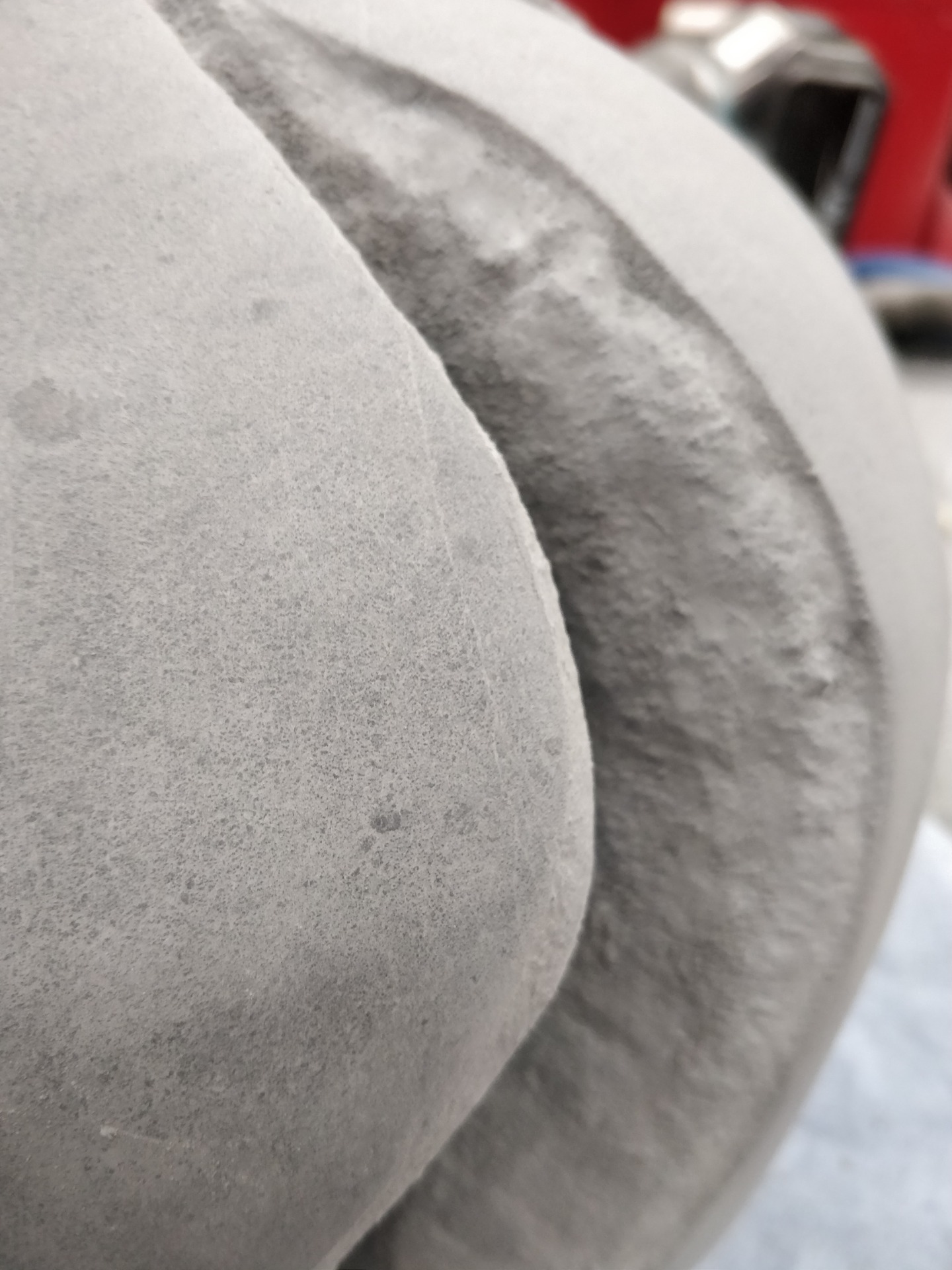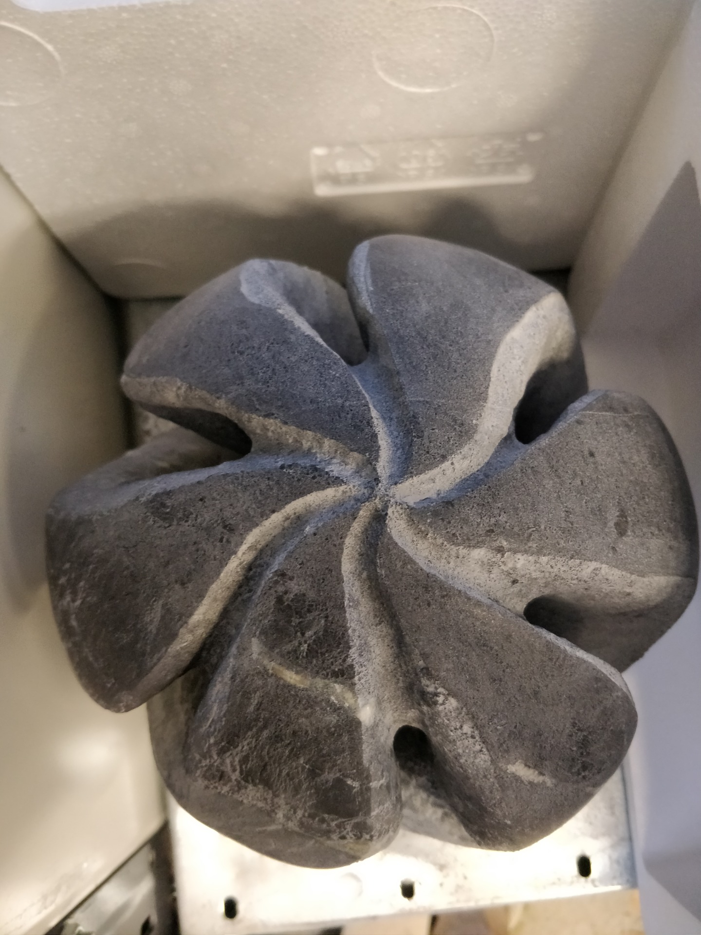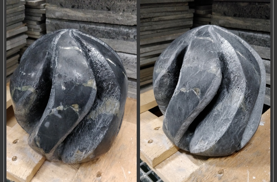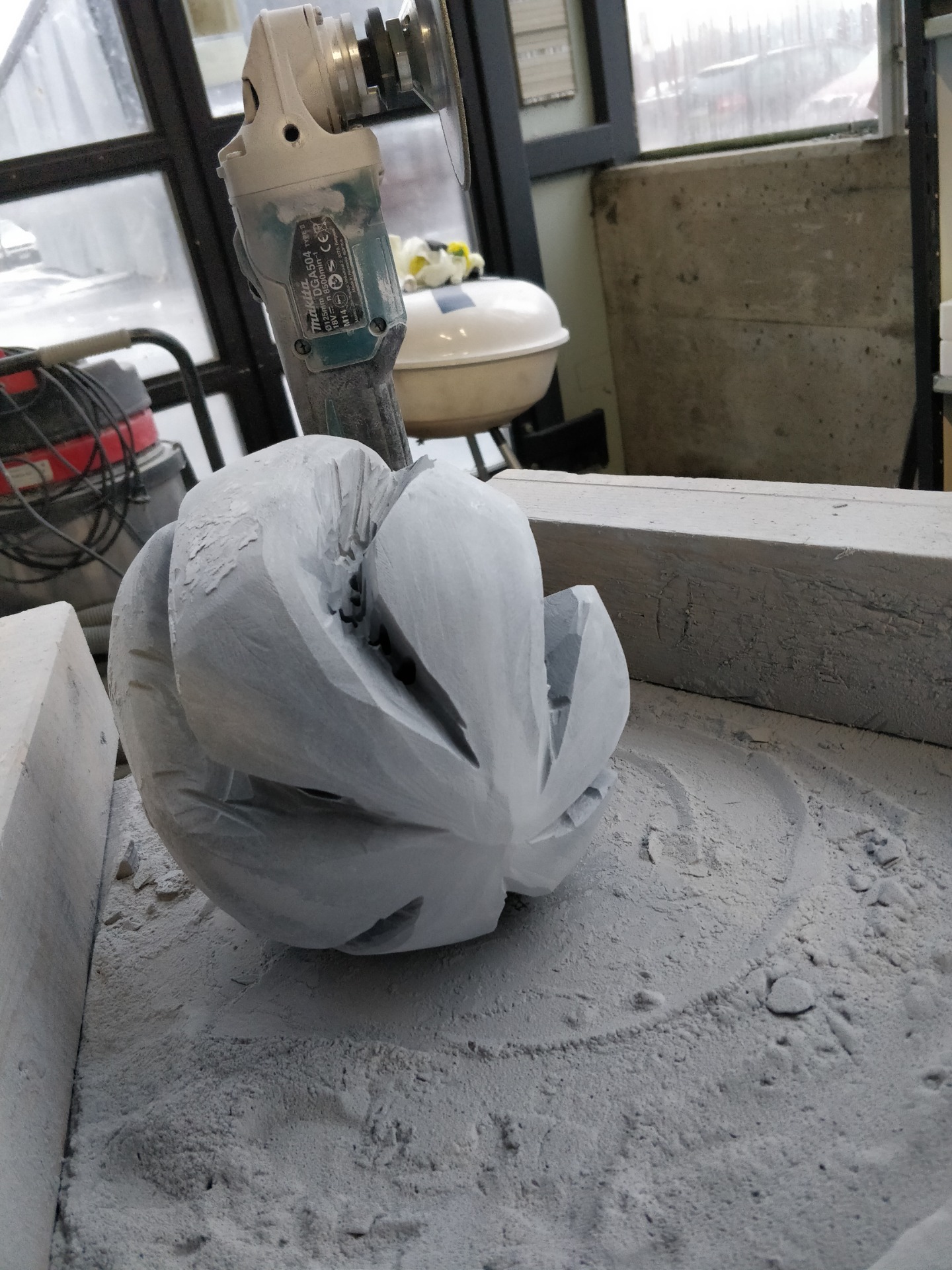 Toivottu muoto saavutettu. Hahmottelin seuraavat muodot kiveen, jonka jälkeen porasin osan merkkiviivoista käsiporakoneella auki keskellä olevaan reikään saakka ja muotoilin rälläkällä loput karkeat muodot.