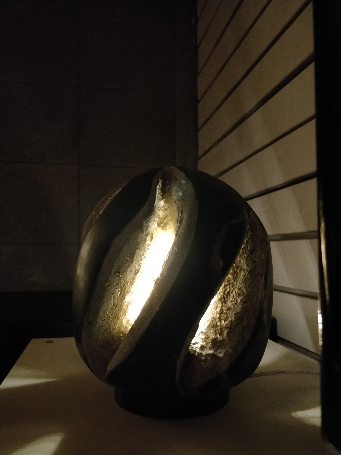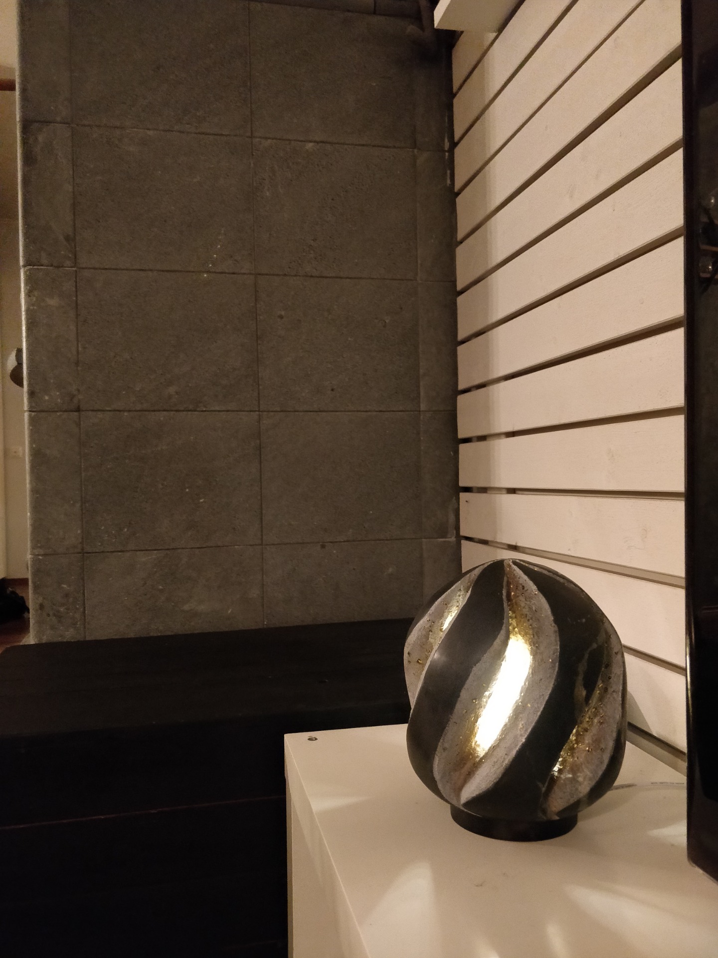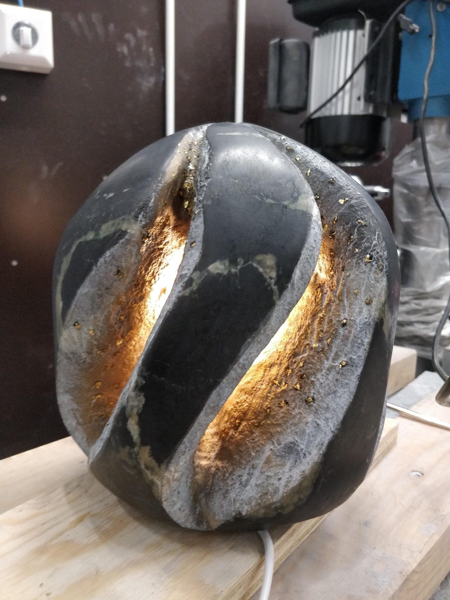 Seuraavaksi hioin ulkopuoliset osat timanttihiomatyynyillä. Vesihionnalla tuli siistein jälki. Vertailussa kuva lampusta märkänä ja kuivana. Harkitsen vielä pintakäsittelyvaihtoehtoja näiden kuvien myötä - wetlook vai drylook? Tarkoituksena on "roiskia" lopuksi sisäpuolelle kultamaalia ja asentaa lämpimän sävyinen ledvalo pohjasta, jossa on rälläkällä tehty ura lampun johdolle. Pohjaan tulee myös kiinni alunen, ettei kivi naarmuta pöytäpintoja.